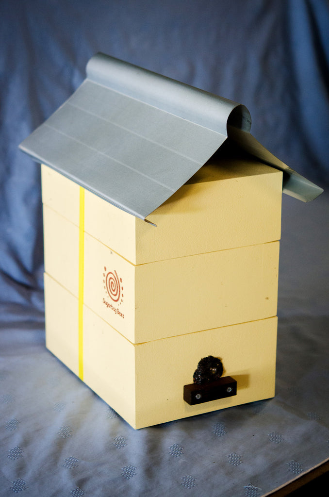 Just like a wooden house, a wooden hive exposed to the elements needs a protective roof. We sell an effective metal roof that extends over the front and back of the hive. It grips onto the hive by its own tension.